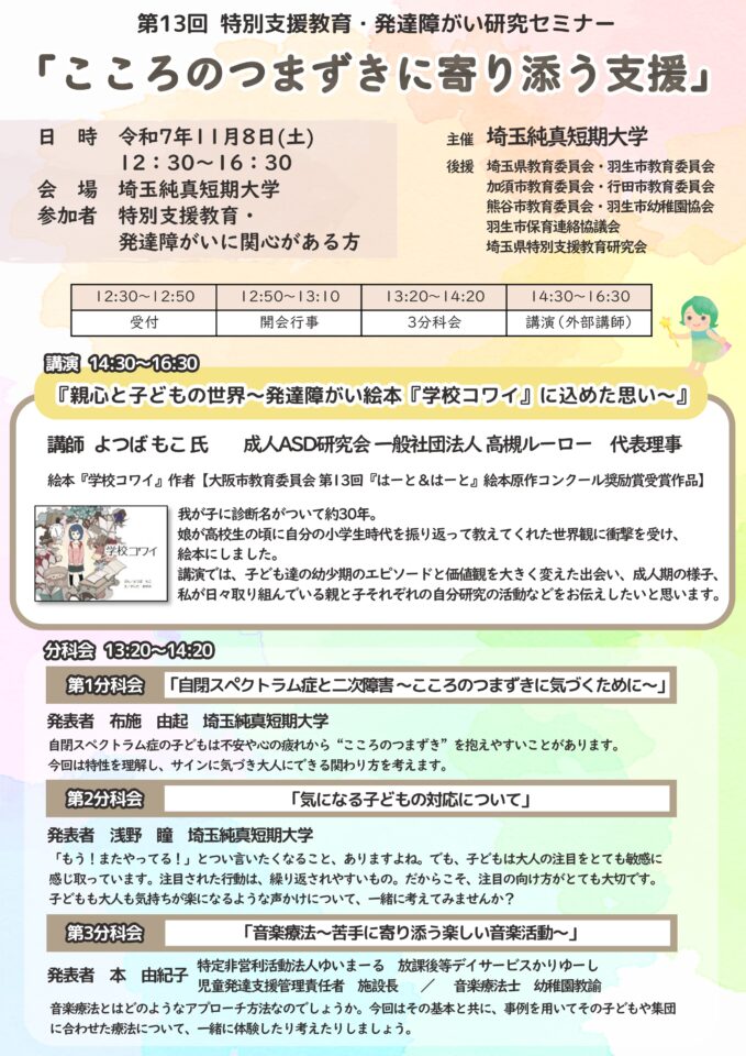 令和7年11月8日(土)に第13回特別支援教育・発達障がい研究セミナー「こころのつまずきに寄り添う支援」を開催いたします。