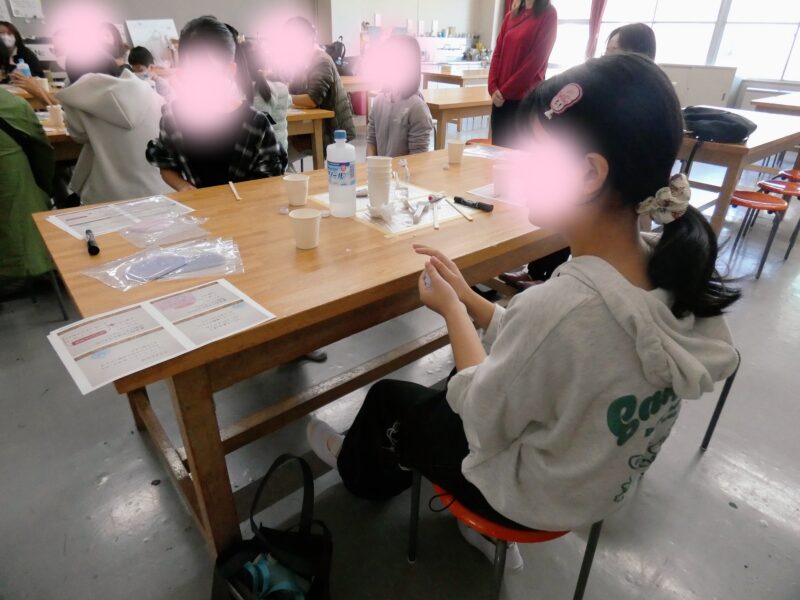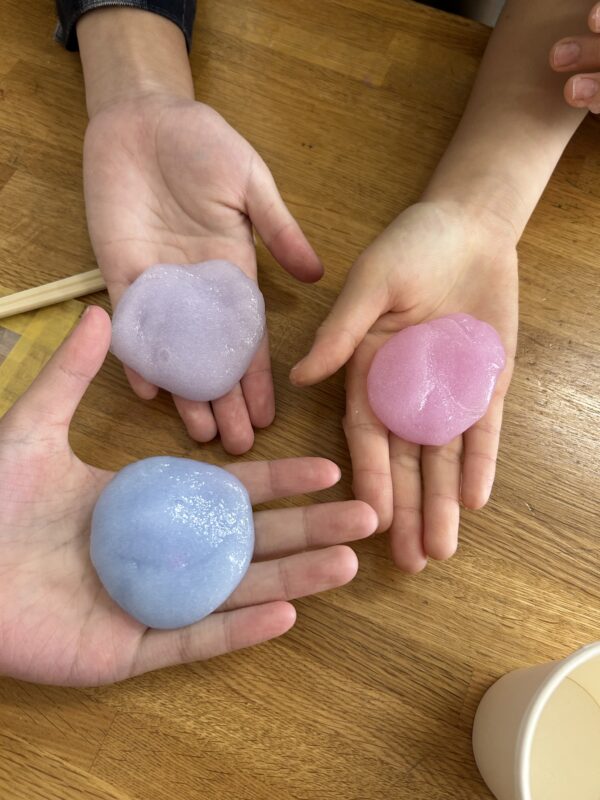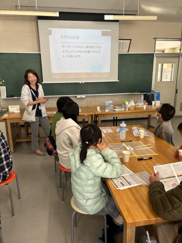 体験授業②作って遊ぼう!ぷにぷにスライム 眞柄絵里先生 身近にある材料を使い3種類のスライムをつくりました。 絵の具を使用して色付けをしたのですが、単色で作る子、工夫して色を混ぜて好きな色を作り上げる子、とそれぞれの個性がよく出ていました。