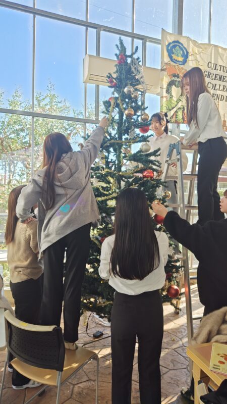授業が終わったあと、1年生の有志メンバーが集まって、わいわい楽しく飾り付けをしてくれました。オーナメントを選びながら「あれかわいい!」「ここに飾ろうよ!」と笑顔が広がり、ツリーの周りは温かな雰囲気に包まれていました。